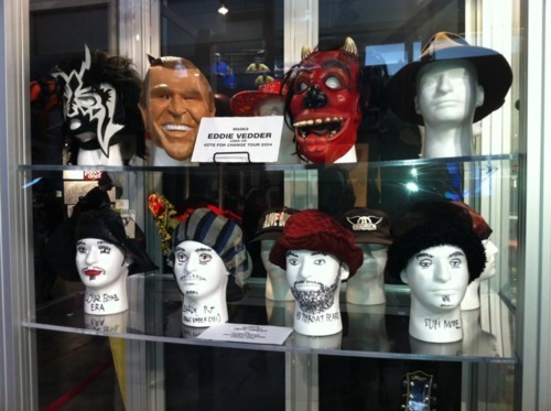 Display at the PJ20 on-site museum: Eddie Vedder's masks and Jeff Ament's hats. (Photo by Zach L for GrungeReport.net)