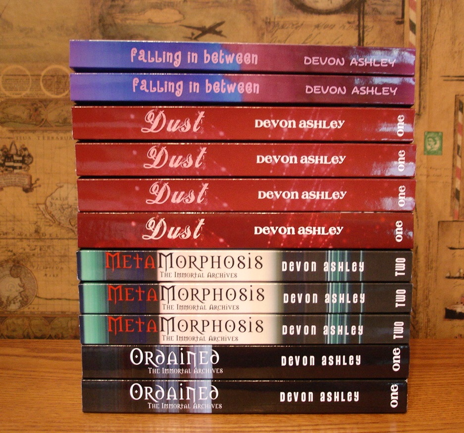 Interiors: FinalCovers: Final, But Not PerfectAll of these have the final copy inside, but have covers that I didn't want to give out to winners. Ordained's cover had a dark print run and wrong font on 'one'. Metamorphosis was printed on a thinner paper, making the book thinner, so the spine bled over the front a little. The same thing happend to three of the Dust books; the fourth had a dark print run. Both of the Falling in Between books had lines mysteriously show up on the sides of the spine.