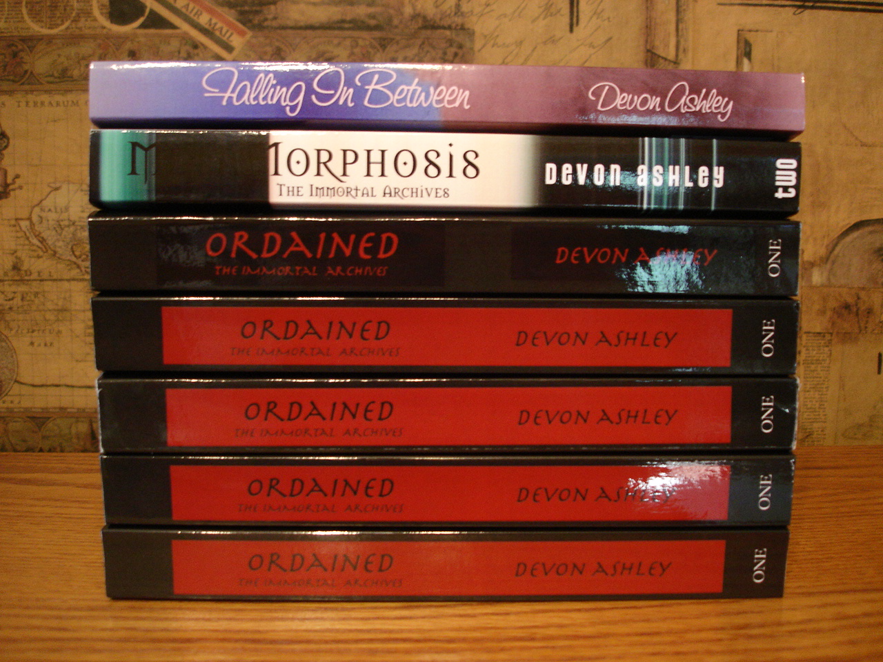Interiors: ARCsCovers: In Progress / Not Final These books are true ARCs and will contain grammatical errors in the story. Also, none of these have the final cover on them. Ordained in particular has a lot of errors because it was my first book and I was totally wet behind the ears. So if lots of mistakes bother you, I don't suggest you enter to win one of these. Also, I remember going in and making minor changes, but they weren't significant enough to alter the story. Falling In Between has some mistakes, but not nearly as many as Ordained. Metamorphosis is actually the final copy inside, but the outside cover was in progress, so I decided to stick it in this tier.