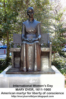 When you hear the words "First Amendment rights," rememberMary Dyer, and that she and her cause were the motive for separation of churchand state in America,and freedom to worship and speak according to your conscience.