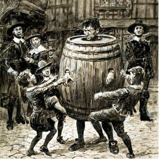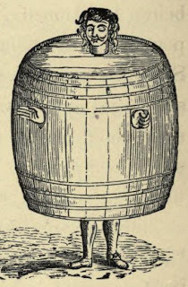 In 1655, John Willis claimed that in Newcastle-upon-Tyne, England, “he hath seen men drove up and down the streets with a great tub or barrel opened in the sides, with a hole in one end to put through their heads, and so cover their shoulders and bodies, down to the small of their legs, and then close the same, called the newfangled cloak, and so make them march to the view of all beholders; and this is their punishments for drunkards and the like.”