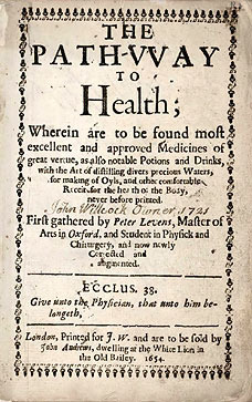 An array of potions and lotions that were considered cures for baldness, body odor, halitosis, and flatulence is chronicled in The Path-Way To Health. The book's subtitle reads: "Wherein are to be found most excellent and approved Medicines of great vertue, as also notable Potions and Drinks, with the Art of distilling divers precious Waters, for making of Oyls, and other comfortable Receit for the health of the body, never before printed." This edition says 1654, but the original