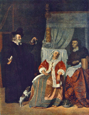 Dr. Clarke, who emigrated to Boston in 1637 and moved with the Hutchinsons and Dyers (and many others) to Rhode Island, returned to England from late 1652 to about 1664, where he was the Rhode Island agent or representative working for their interests, and where he practiced medicine in London. Three editions of Path-Way to Health were published during the times Dr. Clarke lived in England! It’s very likely that he would have known of, or possibly used, this journal. I wonder if he treated Newport families with these or other remedies from the book. Visit of the Physician, by Gabriel Metsu, 1660s