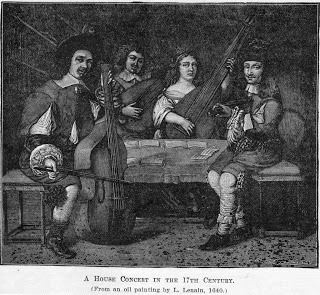 Viol da gamba, two lutes, and a pocket fiddleMusic as art and recreationThough church music was in a woeful state, colonial secularmusic flourished at celebrations of all sorts, including dances and festivals,and urban dwellers spent evenings "consorting" with their instruments,particularly violins and viols. The more highly-educated (ministers, teachers,merchants) had the larger, more expensive instruments like the viol da gamba(six-stringed, but similar in size to the four-stringed cello) or the virginal.Many households who valued music but had less money, used shoulder-held violinsor a cittern, a wire-stringed instrument between a banjo and a mandolin. Militarymen naturally favored the trumpet, fife, or drum.