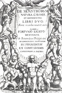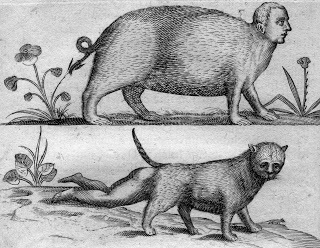 Illustration from De Monstrorum "Monster" was a term commonly used for morethan a hundred years in England,to include conjoined twins, congenital birth defects, stillborn malformedbabies, and even deformed living children. A 1634 book, De Monstrorum, illustrated human-beast hybrids that could come ofbestiality, and in the later 1630s, Governor Winthrop described a pig-humanhybrid with its human father's face. At Plymouth Colony, a young man was convicted and hanged for having carnal knowledge of farm animals. In such cases, following the Old Testament, both man andbeast were destroyed as punishment, and preventive notice to others.