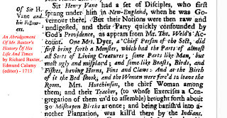 Sir Henry Vane had a set of Disciples, who first sprang underhim in New-England, when he was Governour there, But their Notions werethen raw and undigested, and their-Party quickly confounded by God's Providence, asappears from Mr. Tho. Weld's Account. One Mrs. Dyer, a 'ChiefPerson of the Sect, did first bring forth a Monster, which had theParts of almost all Sorts of Living Creatures; some Parts like Man, butmost ugly and misplac'd ; and some like Beasts, Birds, and Fishes,having Horns, Fins and Claws: And at the Birth of it the Bed shook., and theWomen were forced to leave the room. Mrs. Hutchinson, the chiefWoman among them; and their Teacher, (to whose Exercises a Congregationof them us'd to assemble) brought forth about 30 Mishapen Births atonce; and being banish'd into another Plantation, was kill'd there by the Indians.An Abridgement Of Mr.Baxter's History Of Young Sir Henry Vane, His Life And Times, by RichardBaxter, Edmund Calamy (editor) —1713: "ThePresbyterian view is given by Baxter: 'Sir H. Vane hada set of disciples who first sprang under him in New England. But their notions were then raw and undigested, and theirparty quickly confounded by God's providence.' Baxter's proofs of the divinedisfavor visited upon the New England Antinomians are certain monstrous birthswhich poor Mrs. Hutchinson and one of her female followers [Mary Dyer] broughtforth, — a sad and disgusting recital." Calamy's Abridgment of Baxter's Life of Young SirHenry Vane, pp. 98, 99.
