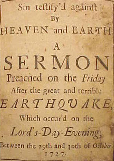 The Hutchinsonians (followers of Anne Hutchinson's religiousfaction) had been in Portsmouth, Rhode Island, for about a monthafter having been exiled from Massachusetts Bay Colony. On Tuesday, June 1, 1638, at2:00 pm, when New England was enjoying a lovely, sunny day, an earthquake struckNew Hampshire, Massachusetts,Connecticut, and Rhode Island. The epicenter was in New Hampshire, and of about 6.5 - 7.0 magnitude,according to modern seismologists, based on its duration of four minutes. There was a large aftershock about 30 minutesafter the main shock, and many more tremors before the earth stilled aboutthree weeks later—just in time for a full eclipse of the moon, which showeditself a dried-blood color.