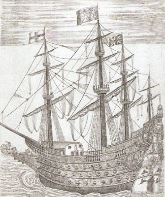 An English passenger ship, James, full of new immigrants (including my ancestors Hannah and John Ayers), nearly foundered as they came south along the New England coast, making for Boston. Rev. Increase Mather wrote, "At this moment,... their lives were given up for lost; but then, in an instant of time, God turned the wind about, which carried them from the rocks of death before their eyes. ...her sails rent in sunder, and split in pieces, as if they had been rotten ragges..."