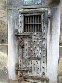 A 17th-century prison door in Warwick, UK.Boston’s prison on Prison Lane, later called Queen Street, had “outer walls ... of stone three feet thick, its unglazed windows barred with iron, the cells partitioned off with plank, the doors covered with iron spikes, the passage-ways like the dark valley of the shadow of death.” https://archive.org/stream/annalsofkingscha01foot/annalsofkingscha01foot_djvu.txt(page 86)