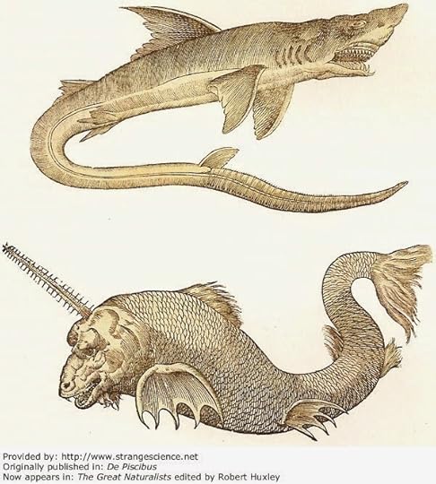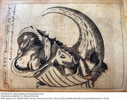 In his Physica Curiosa, Schott included scores of illustrations, many of outlandish creatures, some closer to reality. What real-life animal might have inspired this illustration isn't easy to guess. It has gills, fringes, and a long curling tail, but the predominant feature is its gaping mouth lined with sharp teeth. The teeth are shaped like those of a shark. Source: http://www.strangescience.net/stsea2.htm