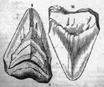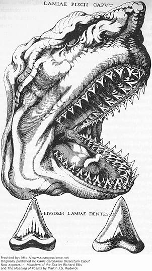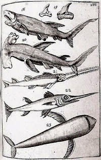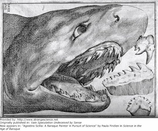 Strange as it looks by today's standards, this picture of a dissected head of a giant white shark actually marked significant progress in marine biology. For years, fossilized shark teeth were believed to be tongues of serpents turned to stone by Saint Paul, and hence were named glossopetrae, or "tongue stones." Niels Stensen correctly identified tongue stones as shark teeth, though he was not the first person in history to do so. In fact, Steno's picture was derived from a 16th-century unpublished work by papal physician Michele Mercati. Source: http://www.strangescience.net/stsea2.htm