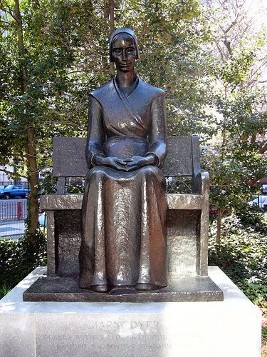 I plan to return to Boston to get that shot. I also plan to find and photograph the other monuments to her, including the statue at Friends Center in Philadelphia. That institution’s website shows how the Friends recognize the importance of her contribution: “The sculpture of Mary Dyer represents the Quaker ideal of committed action grounded in quiet and worship. Her presence at the entrance of the building silently conveys to all who pass through Friends Center’s doors that it is a place of both conviction and contemplation.”