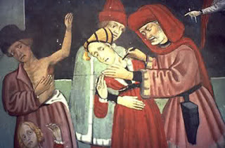 Churchyards’ ground level rose by several feet because the grounds were full. Fields and commons were designated as cemeteries. Many of us have seen illustrations and movies which show carts upended, and shrouded corpses sliding in a heap to the bottom of a pit. But modern archaeology has shown that to be untrue. The plague pits are arranged in orderly layers, with bodies laid out with feet toward the east, just as they’d be in a churchyard or crypt. They were buried in unmarked graves, but they were treated with respect. One has to wonder if the business of death left them with lifelong emotional trauma.