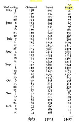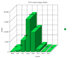 In May 1625, immediately after King James’ funeral, bubonic plague, which was a perennial threat but isolated, broke out in the poorest, most crowded streets of London, where the tenements met the edge of the Thames, and had been flooded four months before. The weekly mortality bills show that the confirmed plague deaths squared and cubed upon themselves.