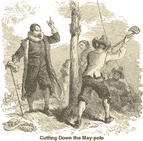 "The Inhabitants of . . . Mare Mount . . . did devise amongst themselves . . . Revels and merriment after the old English custome; (they) prepared to sett up a Maypole upon the festivall day . . . and therefore brewed a barrell of excellent beare . . . to be spent, with other good cheare, for all commers of that day. And . . . they had prepared a song fitting to the time and present occasion. And upon May day they brought the Maypole to the place appointed, with drumes, gunnes, pistols and other fitting instruments, for the purpose; and there erected it with the help of Salvages, that came thether to see the manner of our Revels. A goodly pine tree of 80 foot longe was reared up, with a peare of buckshorns nayled one somewhat neare unto the top of it: where it stood, as a faire sea mark for directions how to finde out the way to mine Hoste of Mare Mount."(Morton, The New England Cannan, Book III, Chapter 14.)