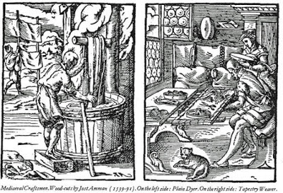 Right image: English dyers, published in a 1596 book in Leyden, Netherlands (the destination of the English Pilgrims between 1610 and 1620, when many of them emigrated to Plymouth, Mass., on the Mayflower.