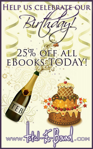 Hi everyone! Just a quick post to give a shout out to my publishers Total-E-Bound who are celebrating their birthday today! Why not drop by their website and take advantage of their fabulous special offer of 25% off all eBooks today! I'm heading on over there right now. :)