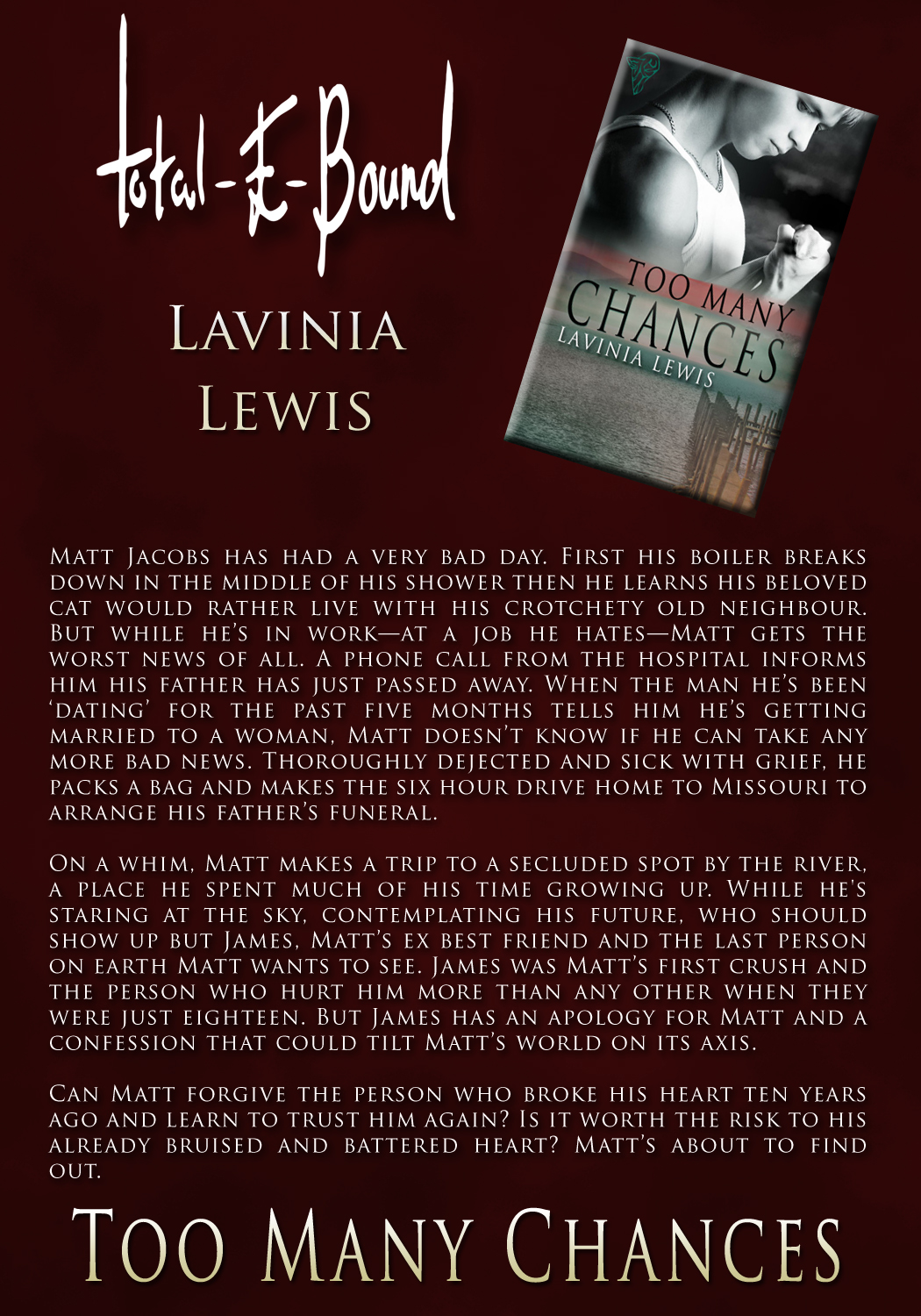 Here's the cover and blurb of Too Many Chances and a little excerpt to whet your appetite.