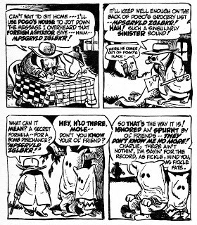 So this drawing is a part of certainly the most significant sequence Kelly did in more than 20 years of drawing the celebrated strip. I can't be sure, but it seems like this character appeared in only about 30 strips. Of course, here you can't see the character per se, but there's even a funny story behind that. There was another character, a chicken, who already had been established as a Rhode Island Red from Providence. When the caricature of McCarthy reappeared in mid-1954 (he had first appeared in 1953), the newspaper in Providence had declared that if his face showed up again they would drop "Pogo." So Kelly, who must have been working on a very short deadline, had Malarkey say "No one from Providence can see me" as the chicken approached, and put a bag over his head. The newspaper got the joke, but indeed Malarkey's face never appeared again.