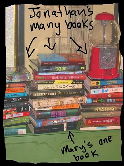 2) the many books Jonathan swears he will read so can he pretty-please buy them all?