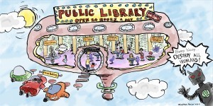 After spending waaaaay too many hours with ink-stained fingers, I recently decided to drag myself into the digital world. This included buying and learning Adobe Photoshop — a double-challenge as I am both stingy and lazy. I asked Mary what I should draw to practice, and she suggested The Library of the Future.