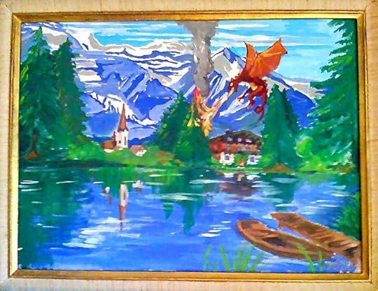 Mary and I are orphans here in Los Angeles. For the last few years, we've taken shelter each Easter with some kindhearted relatives. These relatives are big fans of games and such, and so last year, they initiated a holiday tradition of doing dollar-store crafts. We began with paint-by-numbers. As some of you may recall, I have a low tolerance for toys that require patience or instruction-reading.1 So in order to keep myself interested in such projects, I have to add a few personal touches. Here's what I came up with last year. It's a landscape entitled Dragon and Valley, a Study: