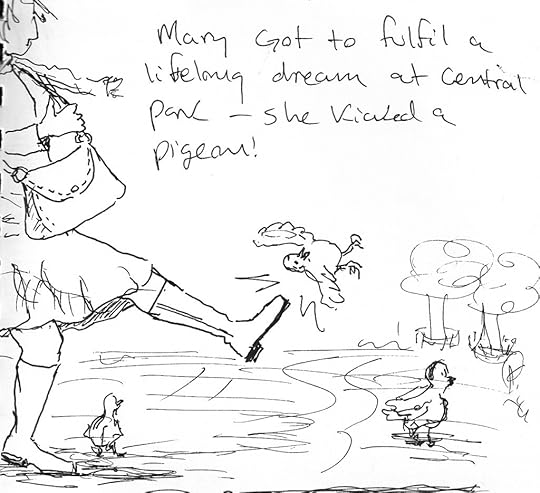 You know how pigeons are always playing chicken (as it were) with pedestrians? Remaining in place until just the last second before flying away? This mocking behavior had led to something of an obsession in my wife — she had long grumbled that one day she'd show those pigeons who was boss. At last that day had come. She kept revisiting the scene that night, explaining how she snuck up on it, closed her eyes, and gave it a good wallop — "Pow! Right in the tail-feathers!"2 I even drew a picture of her triumph in my journal: