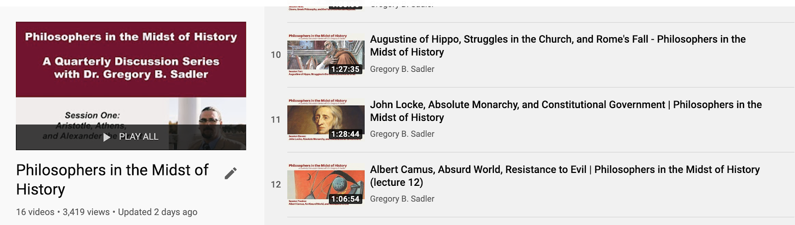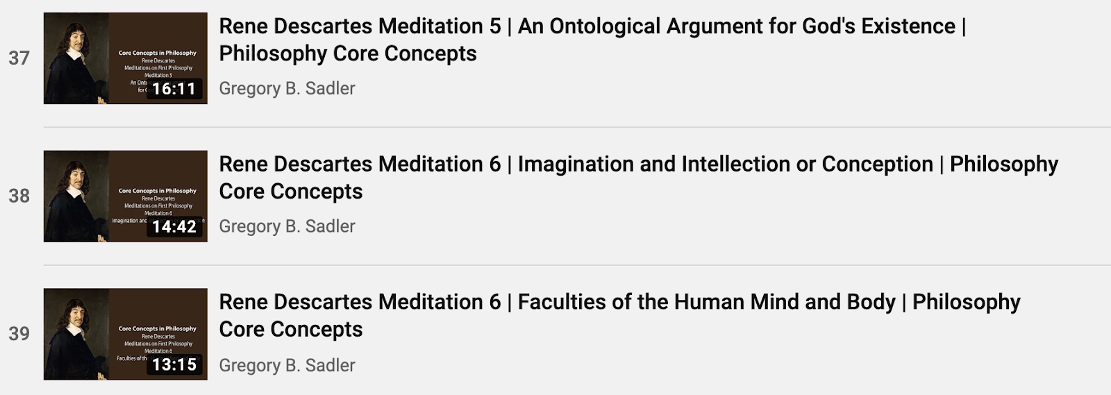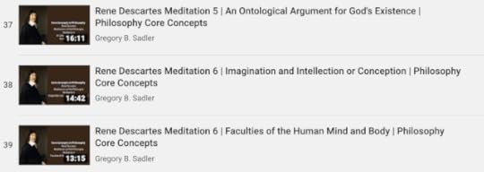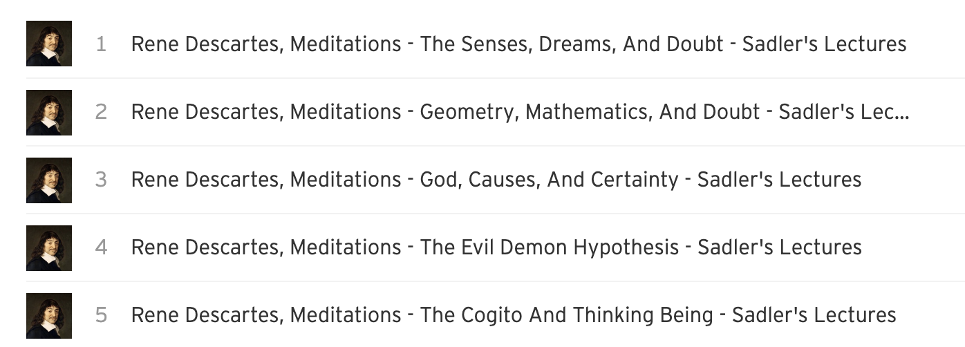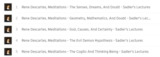 I have been converting my core concept lecture videos into podcast episodes in the Sadler's Lectures series. So far, I've created series on Plato's works - the Apology, Crito, Euthyphro - and on other works by Aristotle, Cicero, Epictetus, Kierkegaard, Rilke, and Sartre. Recently, I created my longest series yet, going through the entirety of Rene Descartes' Meditations on First Philosophy .