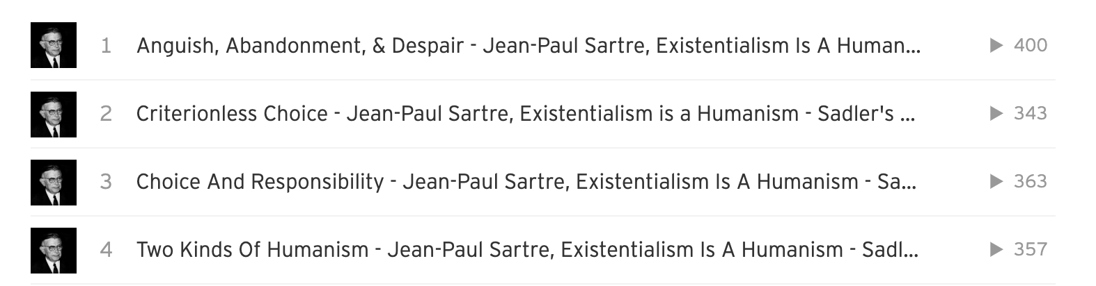 One text I teach frequently is Jean-Paul Sartre's succinct summary of his version of Existentialism, his popular lecture "Existentialism is a Humanism". Over the summer, I took the six lecture videos I created for my students, and turned them into downloadable podcast episodes.