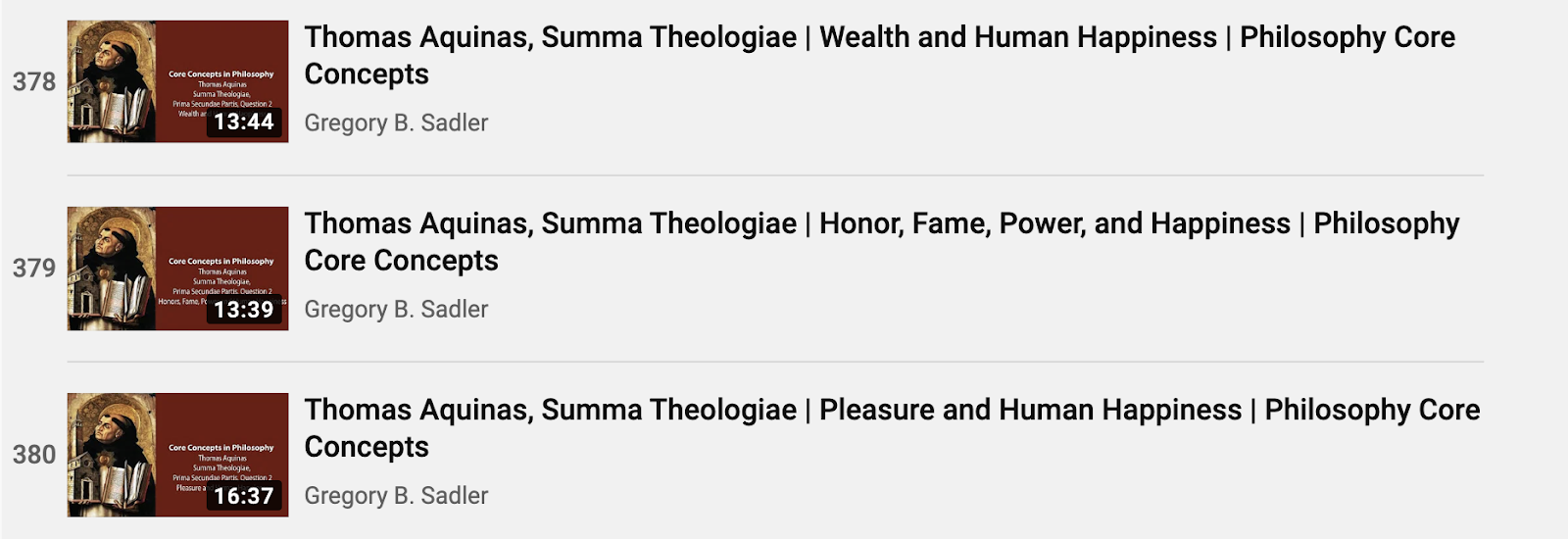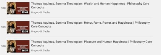 I created another set of short lecture videos for my students, enrolled in my Introduction to Philosophy and my Foundations in Philosophy classes, focused on a key discussion by Thomas Aquinas in question 2 of the First Part of the Second Part of his Summa Theologiae. It is often called the "treatise on happiness", and that is the focus of those discussions. What is the nature of human happiness? What - among the things that people think will make them happy - really does ma...