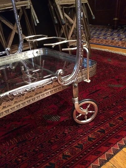 you can kind of see the art nouveau folding chairs behind it...How could I not? It's Italian, 1920s, it's SILVERPLATE! Look at the WHEELS!!!