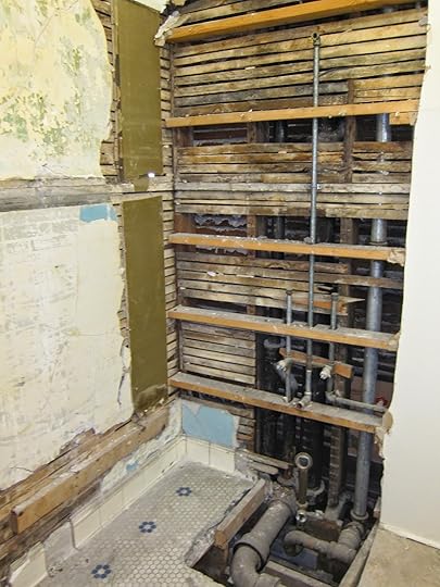 We salvaged all of the woodwork and built-ins for re-use elsewhere (stay tuned for those projects), and are now dealing with the information resulting from the demolition. Because as anyone who has ever renovated a home over 100 years old knows, there are always surprises. Sometimes good, sometimes bad. We got very lucky in the basement, no bad surprises at all. But what we have discovered here does create some challenges. We knew that the construction of the building was steel, so YAY! Won't fall down! We assumed that the floor joists would have been laid out on TOP of the steel beams. Demolition revealed that not to be the case. The floor joists are all laid out directly into the beams. Which creates some serious issues in how we had thought to lay out our plumbing runs and HVAC ductwork. Usually these things go between the joists. On top of the beam. Since the joists run INTO the beams, all of the runs we planned would run smack into the middle of steel beams. Not functional. So we are meeting Monday with our contractors and our architect to come up with some solutions.