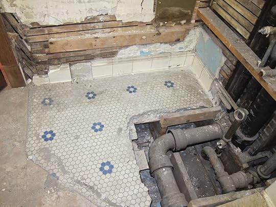 Buried under layers of ghastly linoleum, and partially demolished from previous plumbing work, we are very sad that we can't salvage it. I love that the accent tiles are blue instead of the more common black, and would have loved to just restore a floor like this, but not enough of it survived, so we will be looking into other options. But it was very cool to get to see it, and we are going to try and save some of the cove tiles that are along the baseboard just for our "treasures" box.