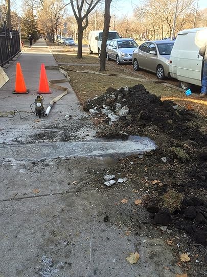 City code requires that a building our size has 1 1/2" pipe for the water main. Ours was 1". And original, so it was lead. Copper is code now. This meant we needed to get new water service. Here is how that works. Your plumber gets a permit for the new water service, and the city comes out to the property to mark where the current pipe is. The plumber digs a trench next to the pipe, and accesses the shut off and the main city pipe, and runs the new pipe parallel to the old pipe, creates a new tap into the city main, and then switches over the service. The city comes out to inspect it, and then you fill the trench back in and deal with your lawn, which now looks like giant gophers have been using it for grenade practice.