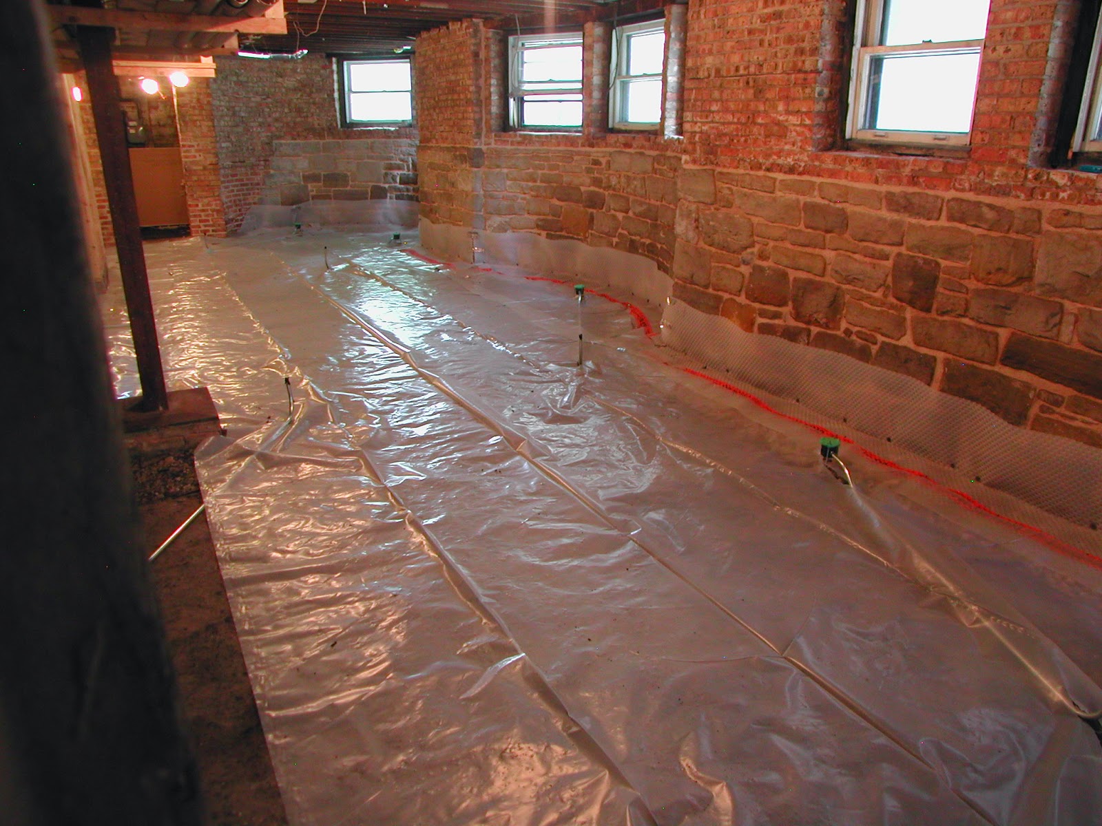 And here is the concrete going in. They covered our newly cleaned and tuckpointed stone walls with plastic to keep them pretty.