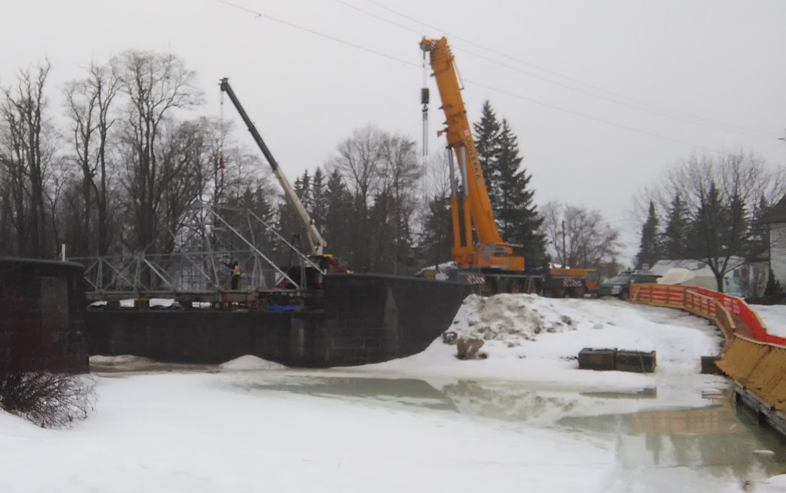 I took the above photo a couple of days ago as the work crew was preparing to remove the bridge and take it away to the place where it will be restored. As you can see on the far right, a temporary walkway has been built across the water. I took the photo from a parking area that will be maintained for the use of those who need to access the island from the south (e.g., residents!) and choose to park and walk. School buses also pick up and drop off kids here while the bridge is out of commission.