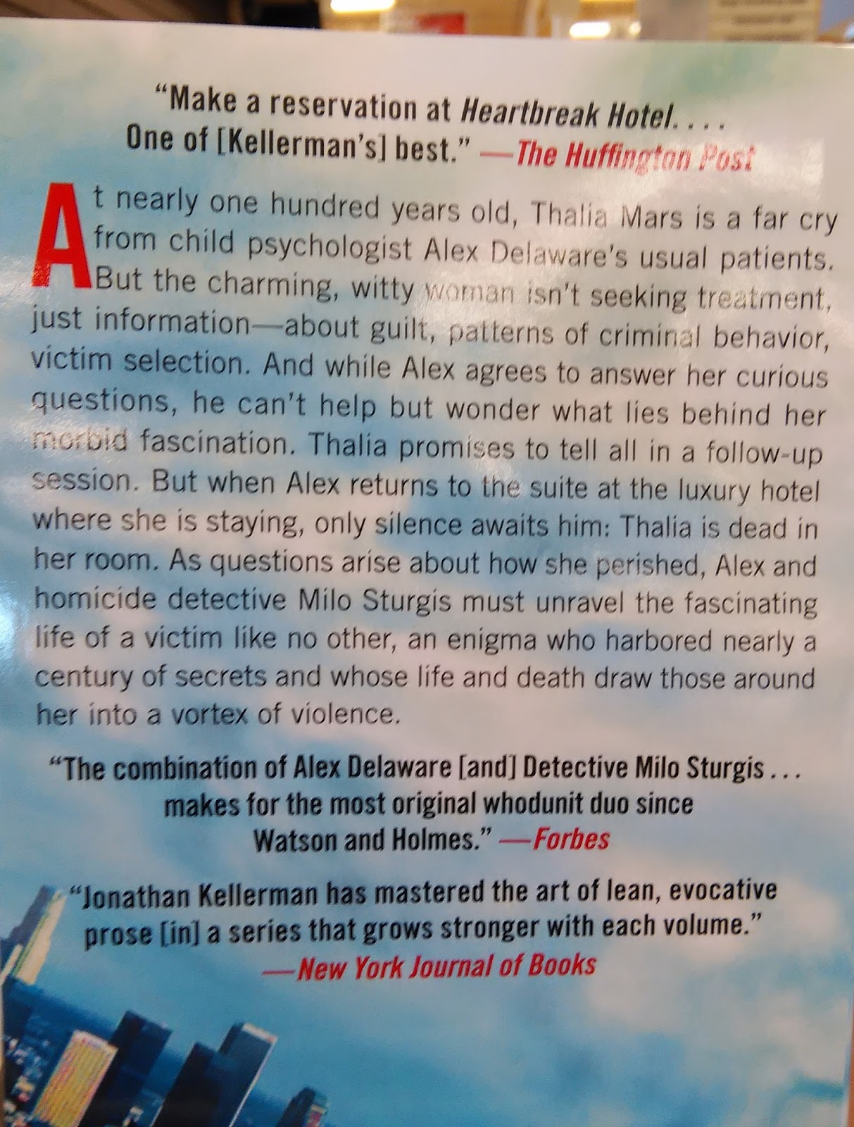 The paperback of Heartbreak Hotel by Jonathan Kellerman (Ballantyne Books) recently hit the book rack in my local grocery store, and lo and behold, there was a money quote from the New York Journal of Books on the back cover. I used my cellphone to snap a photo of it (above).