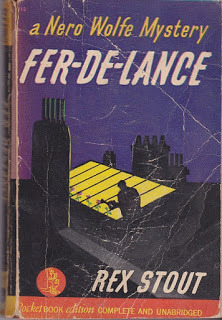 Recently I attended a massive used book sale in Kemptville. On fill-a-box-for-$5 Sunday I spent four hours browsing the tables. I was exhausted at the end but came away with a few treasures. This copy of Fer-De-Lance by Rex Stout was fun to find. It's a little battered, a ninth printing (1944), and not worth much to a collector, but I didn't have a copy and was very pleased to find it. Isn't the cover art striking?