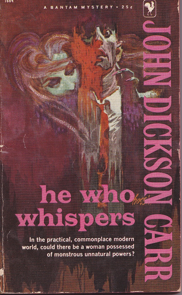 Among the other paperbacks that found their way into my $5 box was this second printing of the U.S. edition (1957) of He Who Whispers by John Dickson Carr. Although I'm somewhat of an indifferent reader of Carr's novels, I was attracted to the cover art on this one.