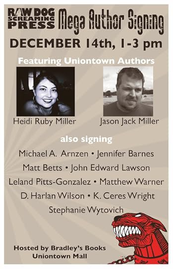 On Saturday, December 14 from 1:00 - 3:00 PM, Bradley's Books at the Uniontown Mall will host a book signing for 13 authors from Raw Dog Screaming Press and Dog Star Books, including Michael Arnzen, Jennifer Barnes, Matt Betts, Leland Pitts-Gonzalez, John Edward Lawson, Heidi Ruby Miller, Jason Jack Miller, Diane Turnshek, Matthew Warner, Albert Wendland, D. Harlan Wilson, K. Ceres Wright, and Stephanie Wytovich.