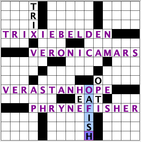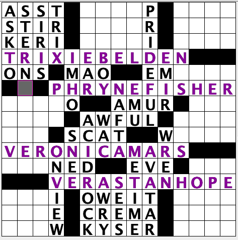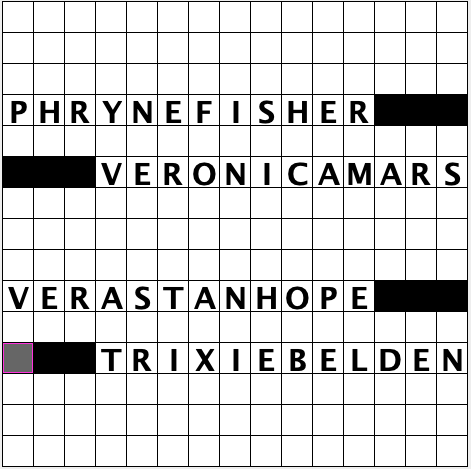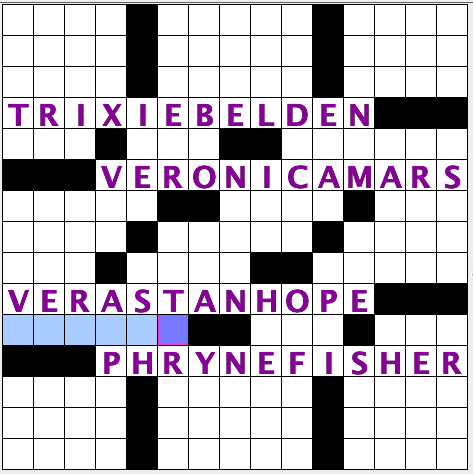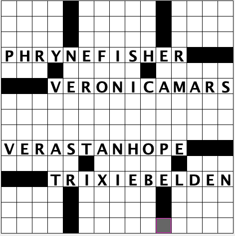 Now I open up a new grid in my Crossfire program and place these four theme entries. I place black squares at the end of PHRYNE FISHER and the program automatically places the corresponding three black squares to maintain symmetry. That’s where I type in TRIXIE BELDEN. Then I do the same with the other two entries.