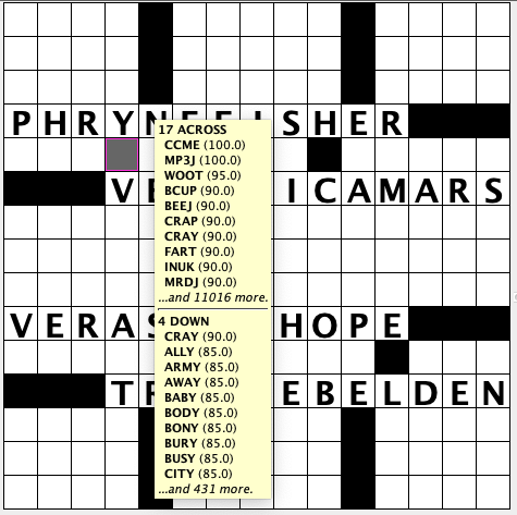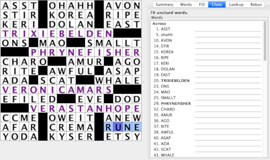 I use the list of potential words as my springboard. As I’m checking the viability of my grid, I’m hovering over the squares, making sure there’s a healthy list of words I can use. Earlier, when I painted myself in the corner with that X in TRIXIE, it’s because I failed to do this. I just got distracted by the cool fill elsewhere.