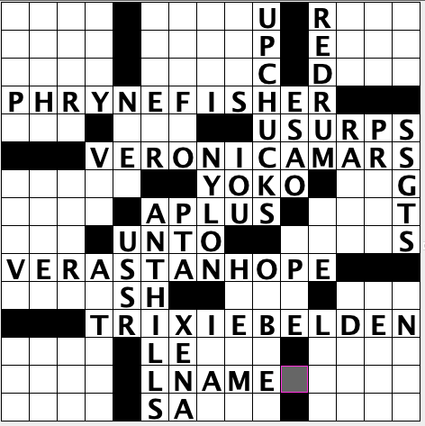 After another 30 minutes the next day, I finally had to concede defeat, giving up on that grid. I moved my theme entries around. If I still have trouble, I can add a black square between the T in STANHOPE and the R in PHRYNE, which will also put a black square between the D in BELDEN and the C in VERONICA. The standard is to have no more than twenty 3-letter words, and by adding them, it would only bring me up to eighteen. But to lose my only 8-letter words would make me sad. Not sad enough not to do it if my frustration level threatens to smother me, mind you.