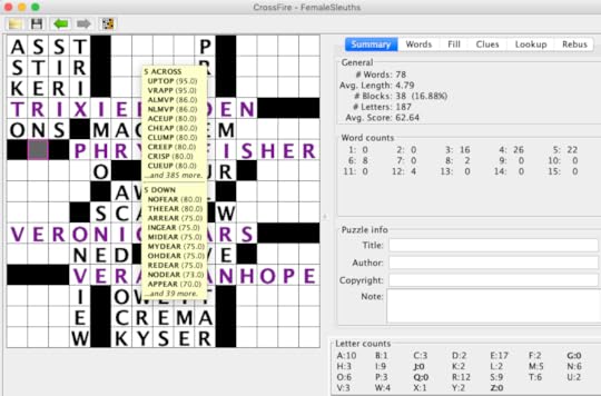 You can also see the rest of the page I get as I work. It shows me how many words and black squares in my puzzle. Because I’m such a novice, I’m stepping a bit over the maximum number of blocks (40 instead of 38), and I’m at the max for number of words (78). It also shows me how many of each letter of the alphabet I’ve used. I try to use at least one of everything, but that’s not a deal-breaker for me. I’m just worried about getting a solid fill. I’ve heard more experienced constructors say it’s perfectly fine to bend the rules to get a better puzzle, so I’ve taken that advice to heart. It has saved my sanity plenty of times.