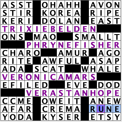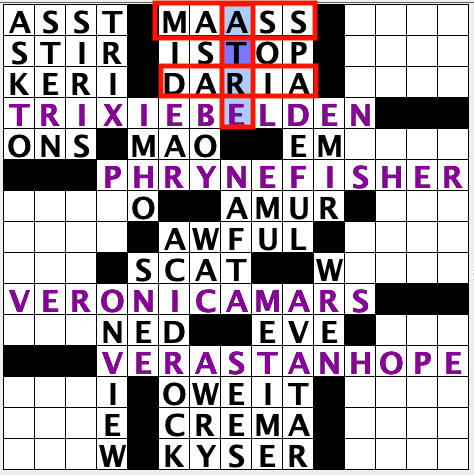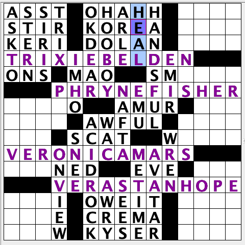 This took me 30 minutes. I started filling the grid before I really studied the grid. Rookie mistake. (And one I keep making. Sigh.) After I did all this, I saw the X in Trixie. Uh oh. Walk away, Becky. Just walk away.