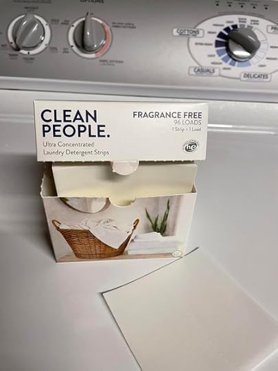 Laundry strips. You can see, I think, that the sheet is perforated. For a regular load, you tear it at the perforation and toss the rectangle into the washer. If you have a particularly large or terrible load, just toss in the entire square. Our clothes come out clean without that heavy perfume scent.