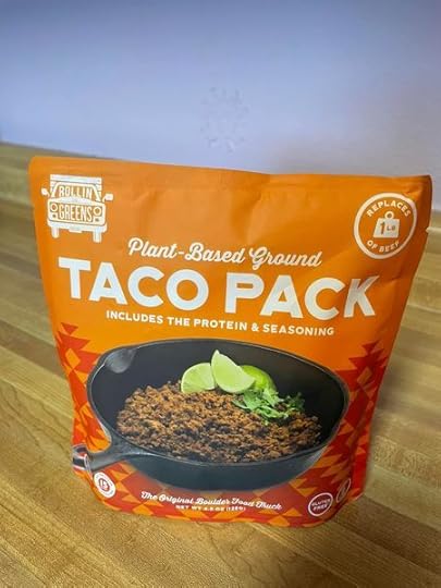 And in our quest to eat less meat, I found some plant-based substitute for tacos, which I crave more than seems rational. It has a long shelf life so you can stock up when there’s a sale, making it cost-effective too. It’s easy to cook, just add it and a bit of your favorite oil to boiling water for ten minutes or so. I add more taco seasoning of my own, to make it even more taco-licious.