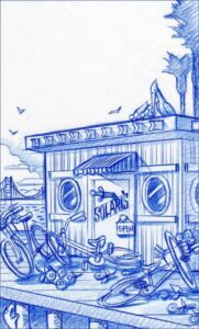 I pointed out this discrepancy and asked them to please change the bridge to the Santa Cruz Boardwalk’s roller coaster, which actually CAN be seen from the wharf, where Sally’s family’s restaurant is located.