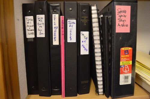 For a series, when the manuscript is done, I tuck the notes, outlines, and anything else specific to that book in a 1″ binder labeled, e.g. “Spice #5 Notes,” and start the process over again for the next in the series. (I have tons of binders leftover from my legal practice, but I can see a day when I might have to go shopping!)