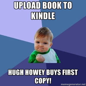 I was replying to a thread in a writers forum to congratulate a fellow self-publisher on her 5,000th sale and I mentioned how I felt inspired by it despite my zero sales and that it gave me hope for my own success. Right after that, Hugh Howey replied and said, “There, I bought a copy. Now you are on your way!” And then I typed some nonsense in return as I fell out of my chair onto my ass.
